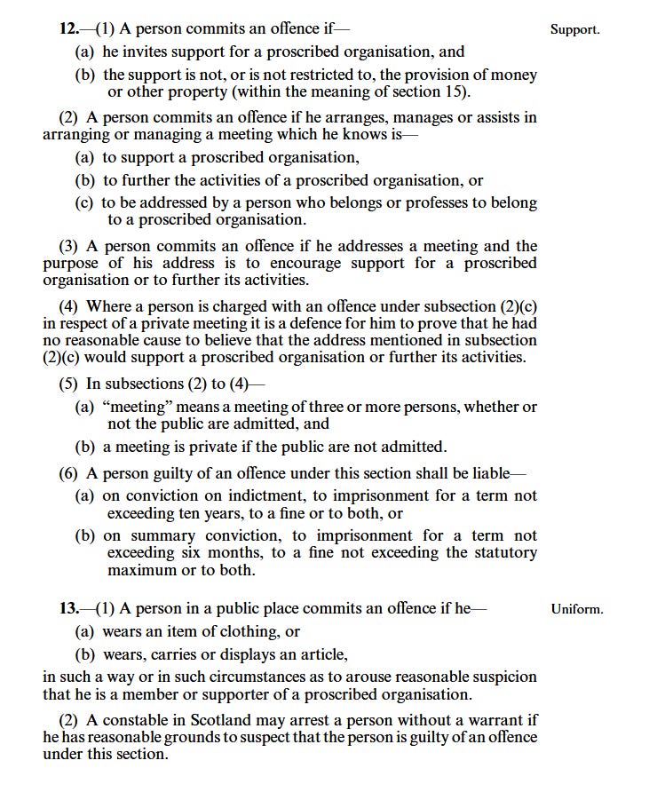 This is the Terrorism Act 2000 as originally passed, by the horrible combination of Jack Straw and Tony Blair. It has since been amended to be even worse and make plain that no intent is required – if you “appear” to support, “recklessly” a proscribed organisation, you can be liable for 14 years imprisonment.