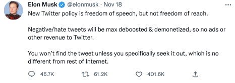 Musk calls himself a “First Amendment absolutist” but he rejects “freedom of reach” — commonly known as shadow banning against “negative” “hate” tweets. However that’s defined. And he says you can’t get certain information unless you “specifically seek it out” — claiming that’s no different than the rest of the internet. He seems to be normalizing shadowbanning and Google’s practice of skewing and hiding information.
