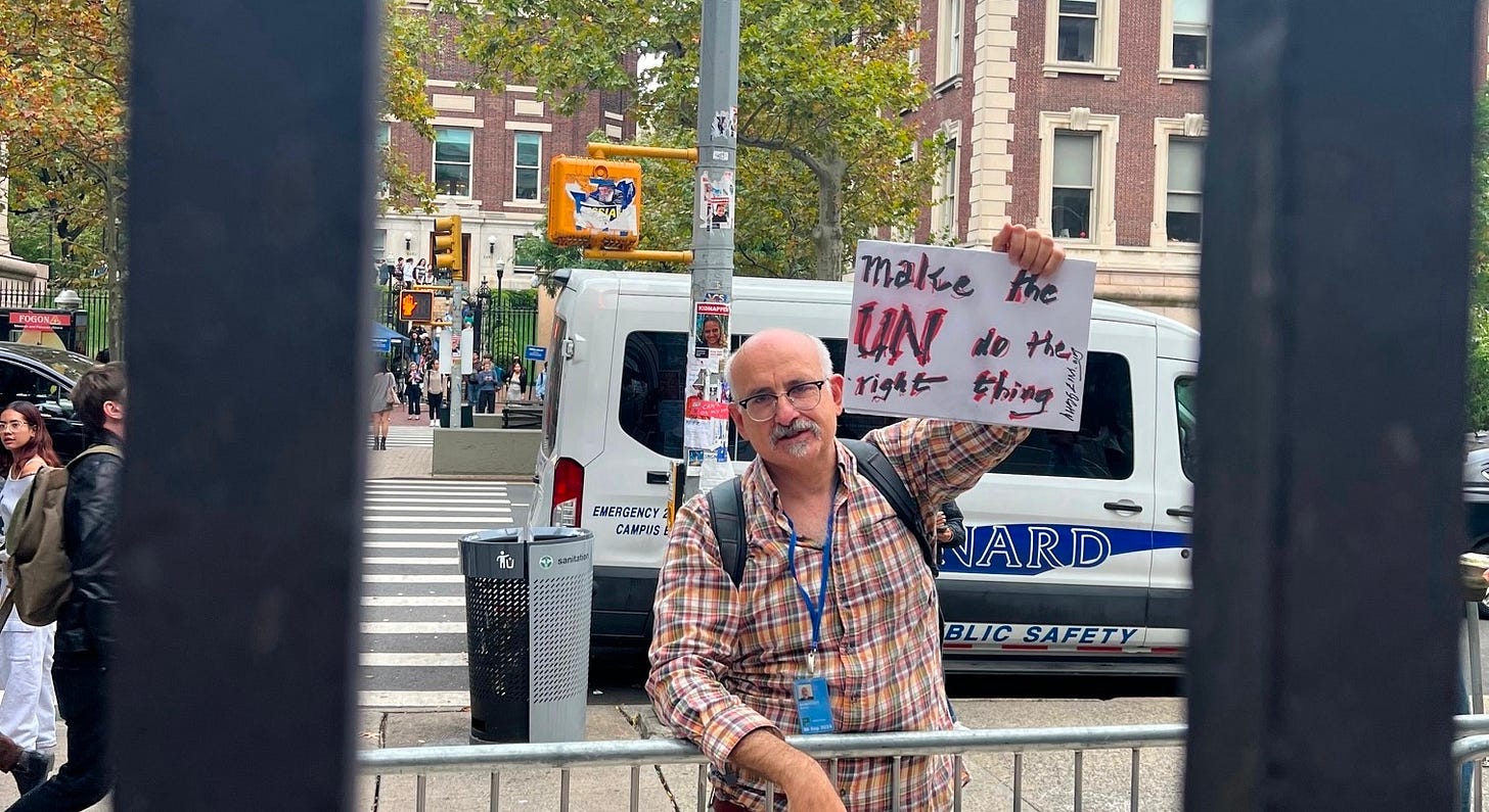 As over a hundred students on the campus held a protest, I held up a sign outside imploring them to “make the UN do the right thing”. Several protesters took notice, some taking photos of me and my sign. One came off campus to chat and sent me the above photo.