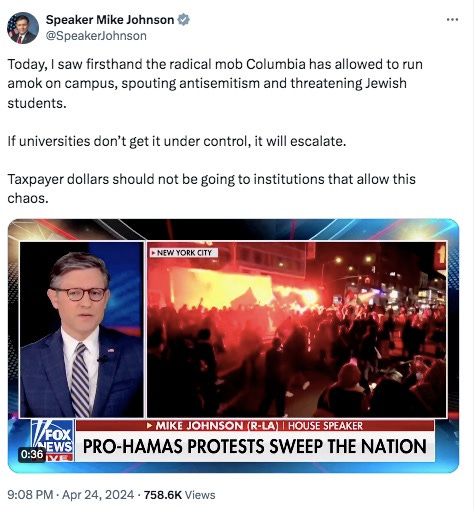 And, per M Miller’s comments, Speaker Mike Johnson threatened Columbia’s federal funding: