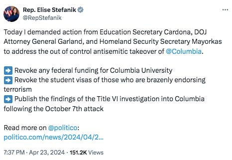 As did Rep. Elise Stefanik, who notably is on the House Committee on Education and the Workforce and on subcommittees on Higher Education and Workforce Investment and Workforce Protections. She’s also on the House Armed Services Committee, the House Permanent Select Committee on Intelligence, and particularly ironically, the Select Subcommittee on the Weaponization of the Federal Government.