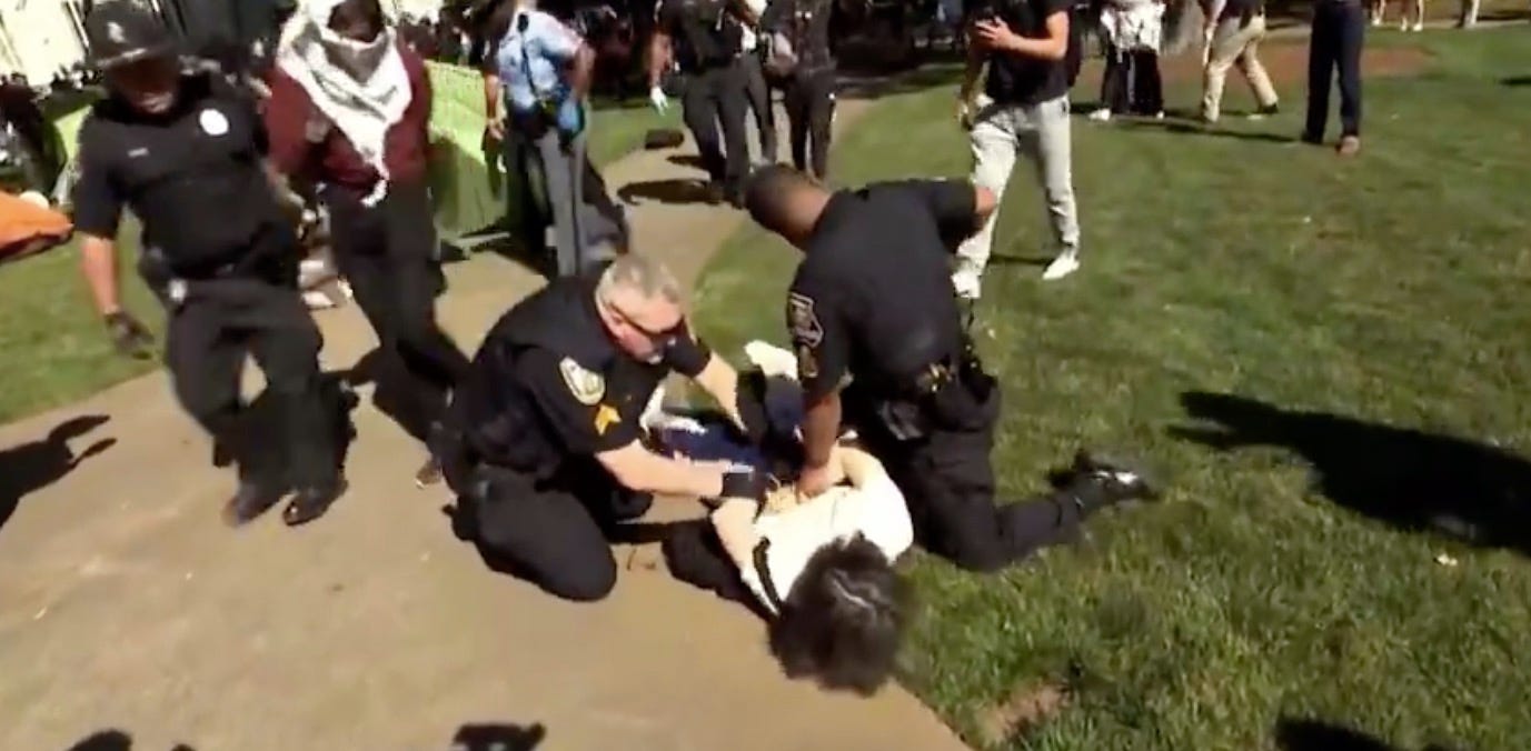 As I saw videos of “security” forces brutally throwing students, media workers and even professors to the ground, I was reminded of Karl Marx’s adage, "When the train of history hits a curve, the intellectuals fall off." 1 The video above is a manifestation of the fascist underbelly of US society, usually unseen or ignored by many liberals...