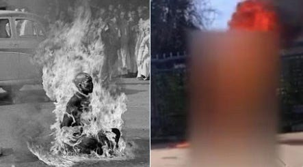 Correction: Thich Quang Duc immolating himself to wake people up about oppression of the US-backed South Vietnamese government, not the Vietnam War.