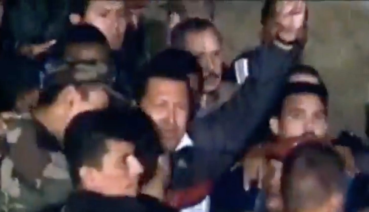 Zei Squirrel notes that in 2002 “the US regime orchestrated a coup in Venezuela, and Chavez was kidnapped and taken away by helicopter to be executed by CIA-Mossad agents. But the Venezuelan masses came out onto the streets demanding their president, and quickly overthrew the fascist coup regime and forced Chavez’ return. This was all captured in the brilliant documentary ‘The Revolution Will not be Televised’.” (I had some involvement in this I hope to write about sometime.)