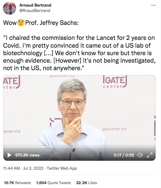 Sachs recently said in Spain: "I’ll add one provocative statement … I chaired a commission for the Lancet for two years on Covid. I'm pretty convinced it came out of US lab biotechnology — not out of nature — just to mention after two years of intensive work on this. So it's a blunder, in my view, of biotech — not an accident of a natural spillover. We don't know for sure, I should be absolutely clear. But there is enough evidence that it should be looked into. And it's not being investigated, not in the United States, not anywhere. And I think for real reasons, that they don’t want to look underneath the rug control.” (Some of his utterance is unclear and the subject of some debate, see full video and clip.)