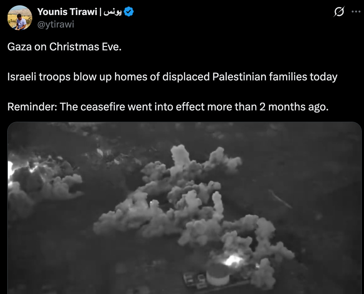 I've suspected that part of targeting Venezuela now was a distraction from Gaza, and the escalating attacks by Israel against Bethlehem — esp around Christmas — and the rest of the West Bank. It felt similar to Trump doing his "Fire and Fury" think re Korea, which was on Aug 8, 2017 So I went back to see what I was tweeting about just then. Turns out it was the date of news conf re Syria. …