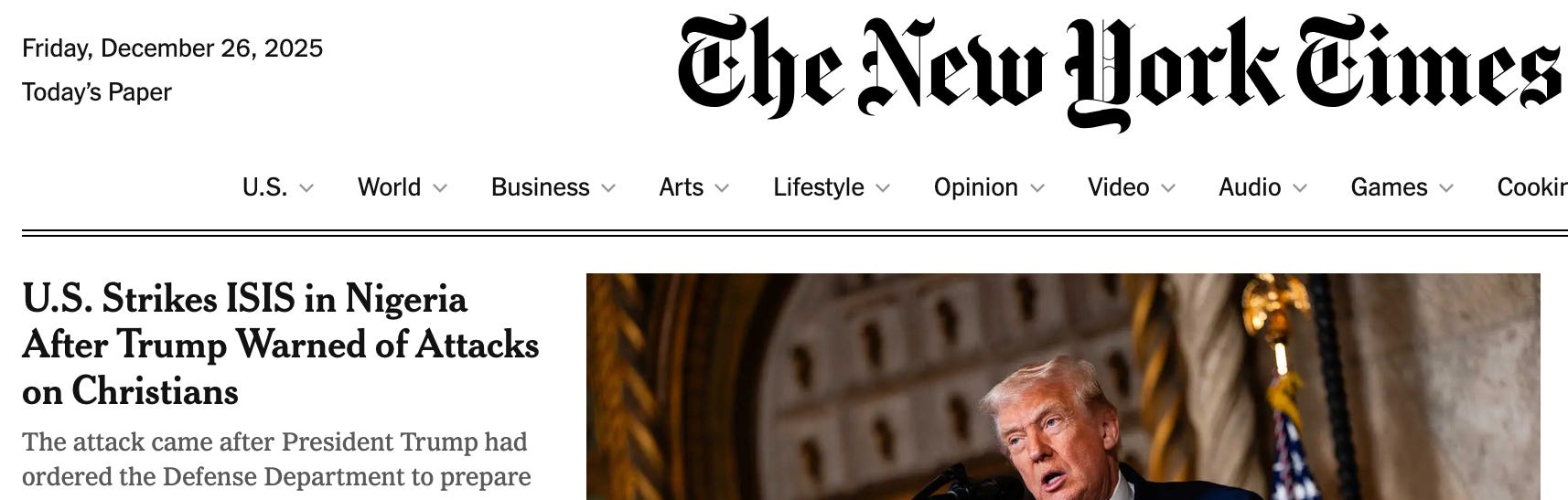 Trump’s hyper-Christmas optics and ridiculous claim to have brought “for the first time in 3,000 years peace to the Middle East” atop his Dec. 17 address were part of a wider strategy that fit in with bombing Nigeria on Christmas Day. This was the latest chapter of orchestrated machinations to manipulate the public mind.