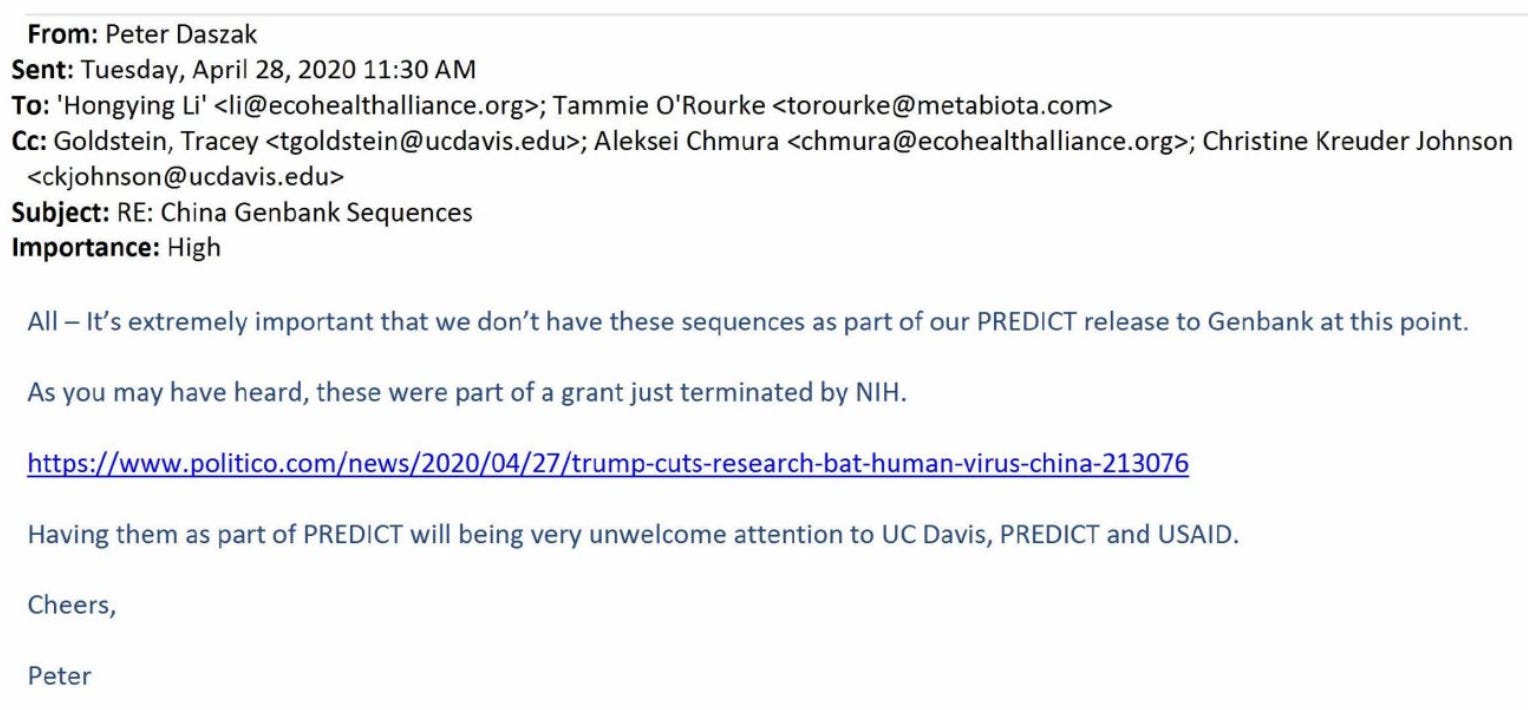 HUSSEINI: But the stipulation here is that this collaboration could have caused the problems. Specific question, has Dennis Carroll, who headed the PREDICT Program, been investigated and held accountable for unlawfully diverting USAID funds to the Global Virome Project, the private organization he would formally join after leaving USAID?