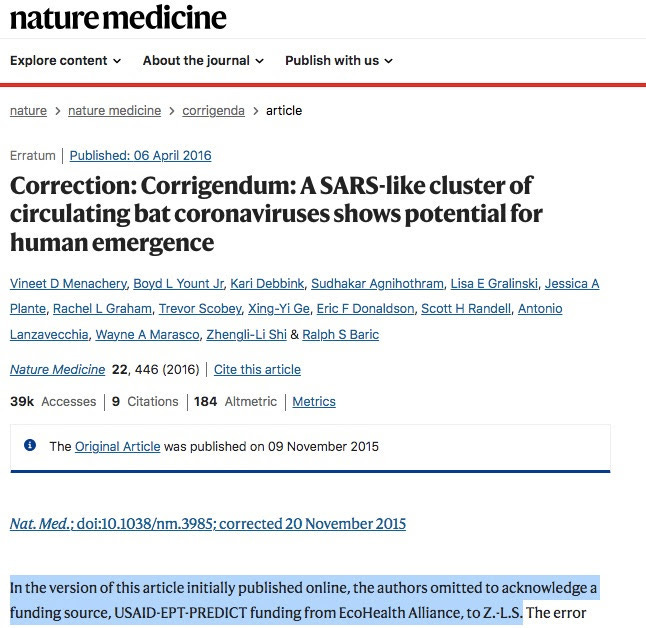 After mentioning this to Miller, I cited the fact that a 2016 correction to a well-known Nature Medicine article stated that USAID had funded Zhengli-Li Shi’s work at the Wuhan Institute of Virology through EcoHealth Alliance.