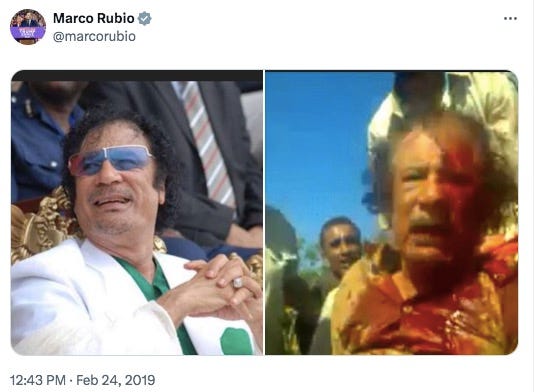 Marco Rubio at the last Republican debate in 2016 attempted to justify George W. Bush invading Iraq: “No matter what you want to say about weapons of mass destruction, Saddam Hussein was in violation of UN resolutions, in open violation, and the world wouldn’t do anything about it, and George W. Bush enforced what the international community refused to do.”