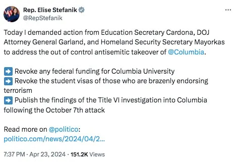 Her main claim to fame is that she helped lead the charge in shutting down free speech on college campuses, including by threatening federal funding of the universities in question.