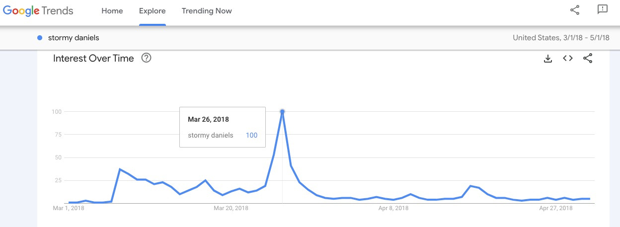 March 25, 2018: USA Today reports in “Stormy Daniels to '60 Minutes': I feared for my safety after threat to 'Leave Trump alone’” that “Adult film actress Stormy Daniels said she agreed to accept what she called an ‘extremely low’ payout of $130,000 days before the 2016 presidential election to remain silent about her alleged affair with Donald Trump because she had been threatened years earlier and still feared for her safety.”