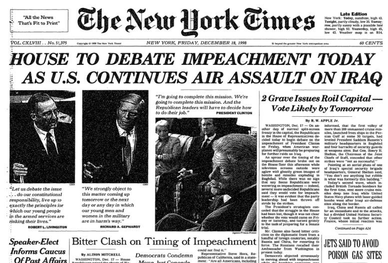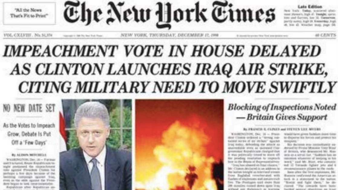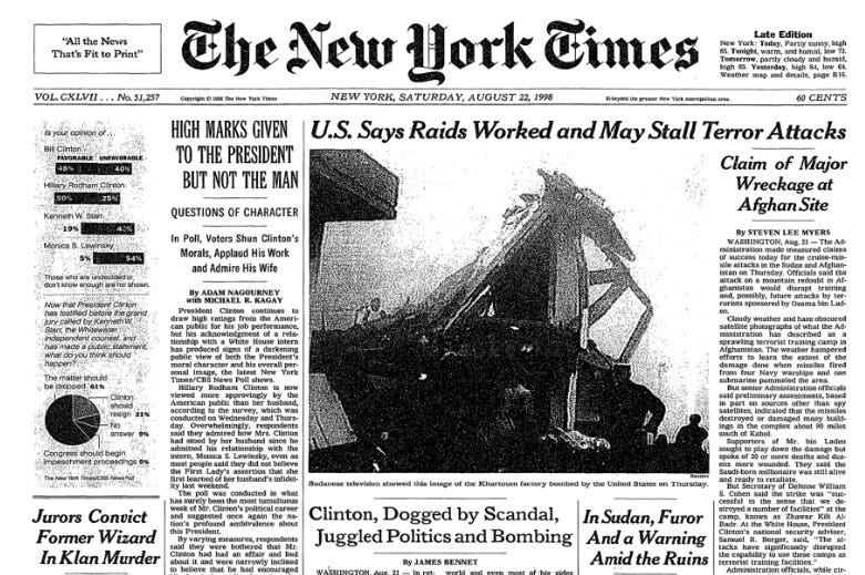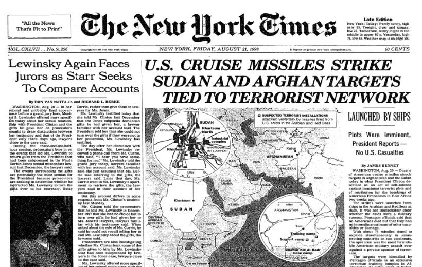 On August 20, 1998, as Monica Lewinsky was testifying before a grand jury, Clinton bombed Afghanistan and a pharmaceutical plant in the Sudan, justifying the attack with a series of fabrications which would even be debunked soon after by James Risen and others in the New York Times.